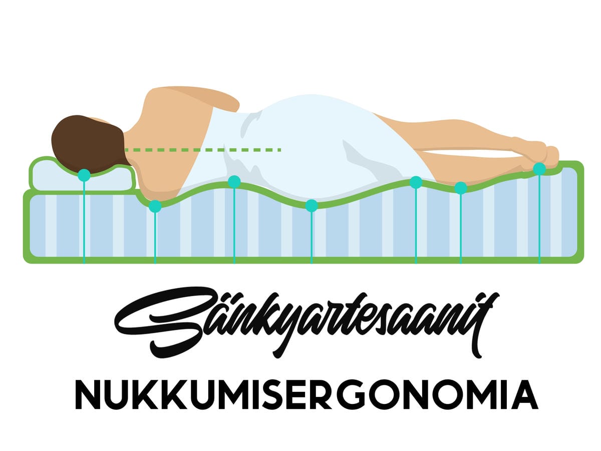 pätee myös laadukkaan unen saavuttamisessa. Eli voit itse hyvillä valinnoillasi luoda ergonomisen nukkumisympäristön, jossa saat oikeasti palautua ja nukkua hyvin. Tärkeimmät lähtökohdat tämän saavuttamiseksi ovat oikeat ”työkalut”, jotka tässä tapauksessa tarkoittavat tietysti juuri sinulle oikeaa sänkyä sekä tyynyä. Niiden olennaisin tehtävä on huolehtia, että nukkujan kroppa ja selkäranka suhteessa niskaan on paineettomassa tilassa. Kun nukkuja on paineettomassa tilassa, ääreisverenkierto toimii ja keho saa täyttä lepoa ilman turhaa pyörimistä sängyssä sekä paikkojen puutumisesta tai asennon vaihtelusta johtuvaa liikehdintää.