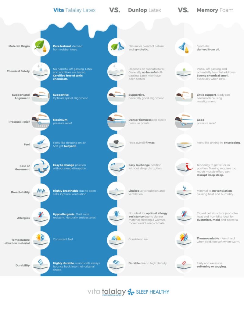 Vita Talalay-materiaalille ei ole ikinä tavattu allergista ihmistä. Patjavaahto ei sisällä kemiallisia säilöntäaineita tai öljypohjaisia-aineita.