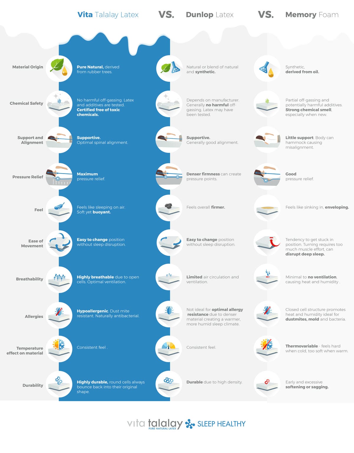 Vita Talalay on tutkitusti markkinoiden arvostetuin patjavaahto. Puhdas luonnonmateriaali on kemikaalivapaa ja sen ansiosta terveellisin ja allergisoimattomin valinta.