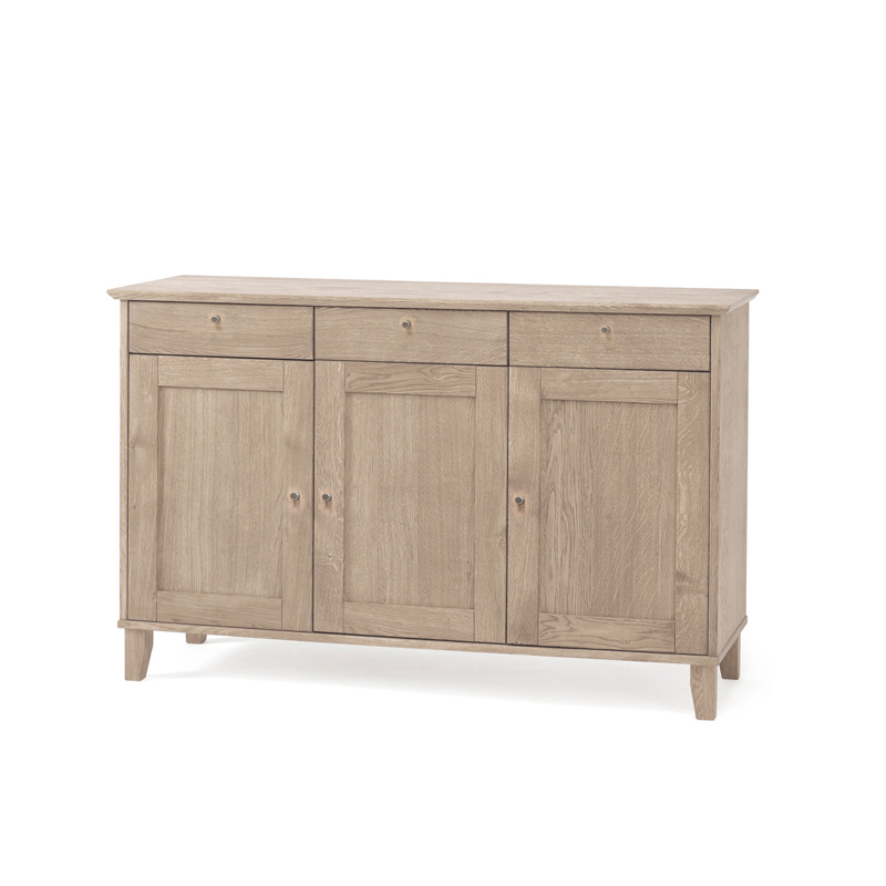 Vendi-sivupöytä, jossa on kolme ovea ja kolme laatikkoa. Yksi hylly kunkin oven takana.